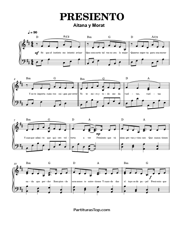 Partitura Presiento Aitana y Morat – Partitura Piano Pdf. Compás 4/4, Tonalidad : D Mayor, Tempo de ♩ = 90